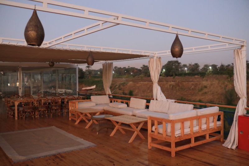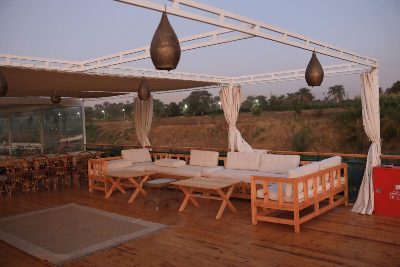 Spacious sun deck with Egyptian-style lounges and sunbeds